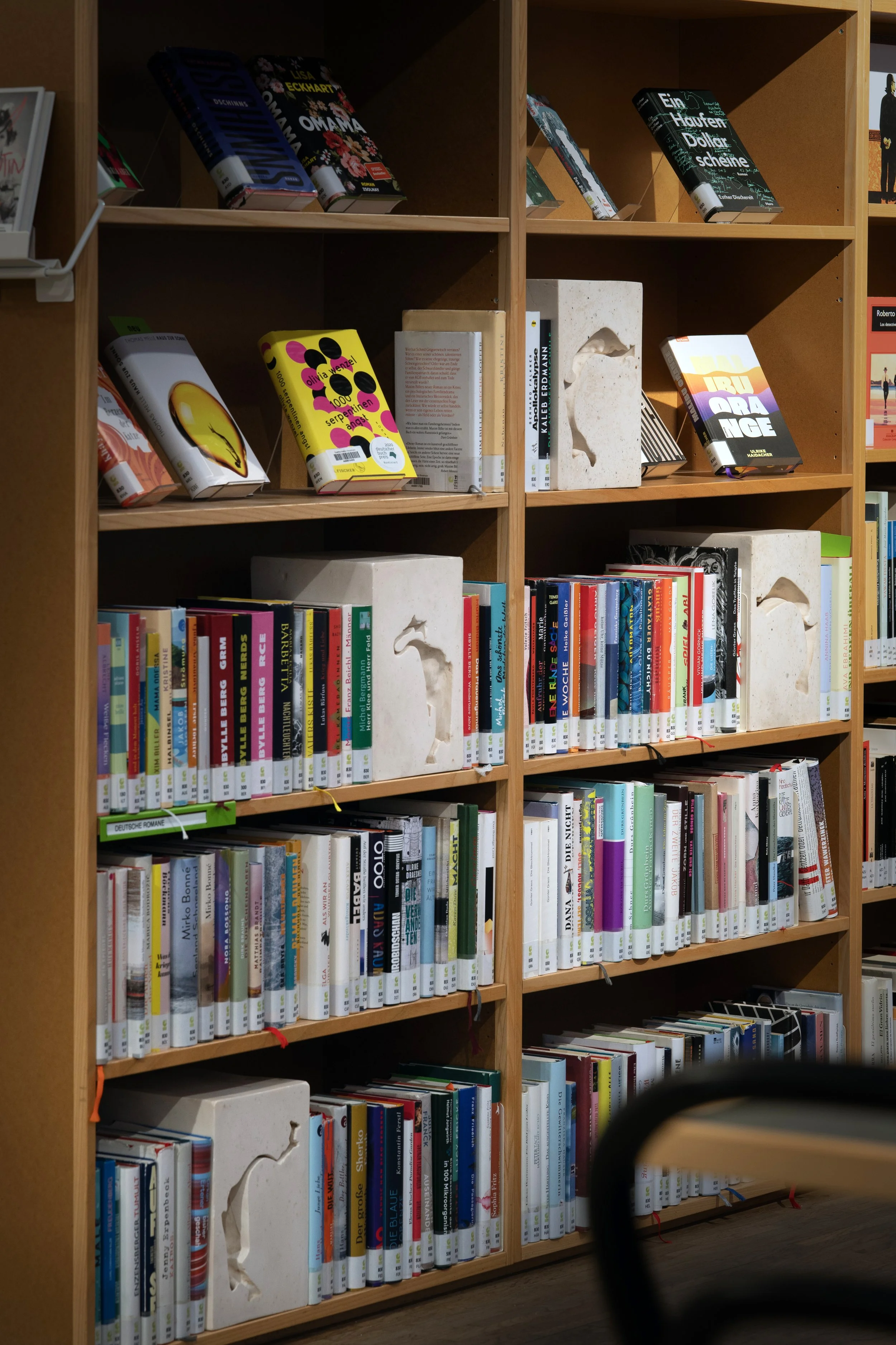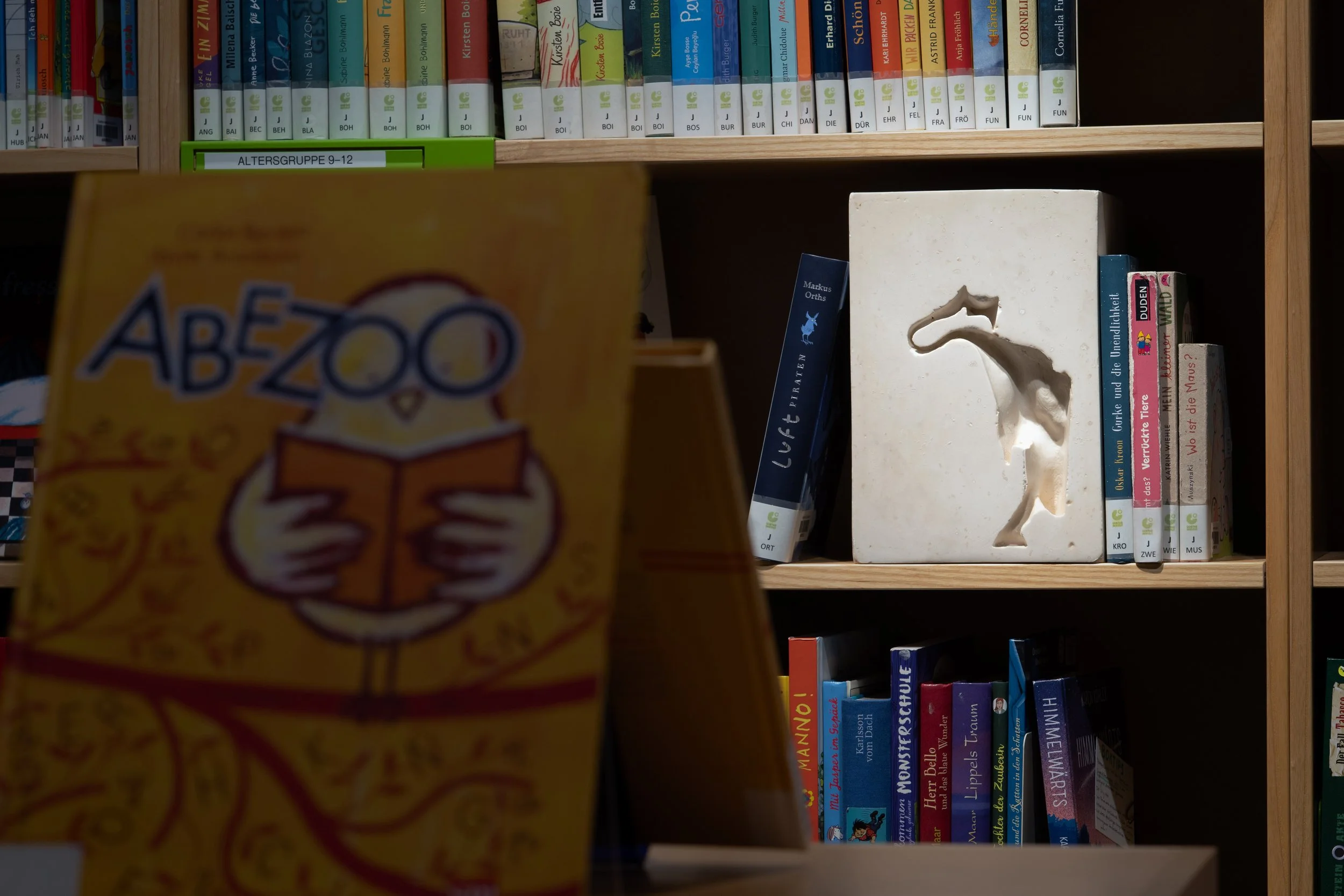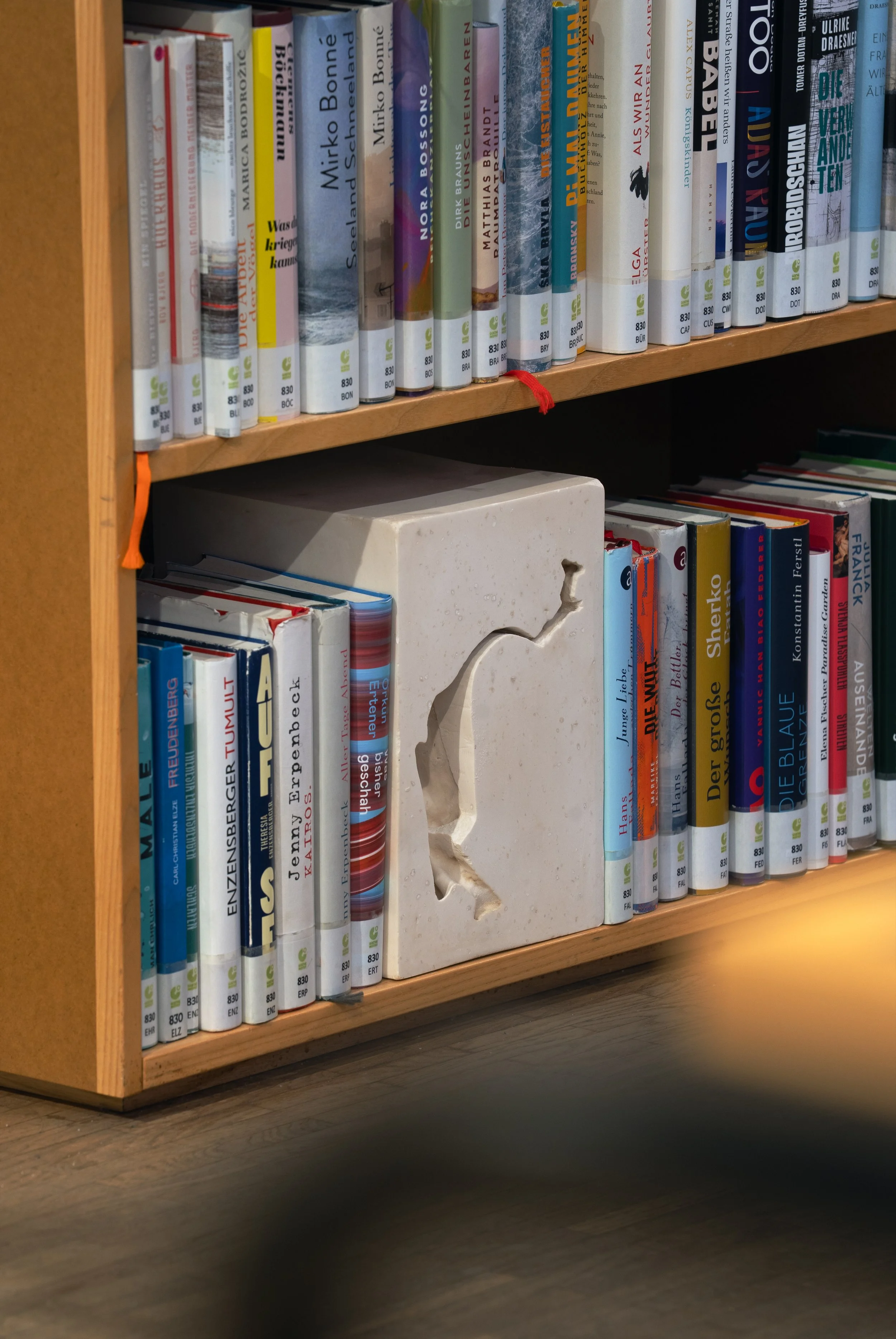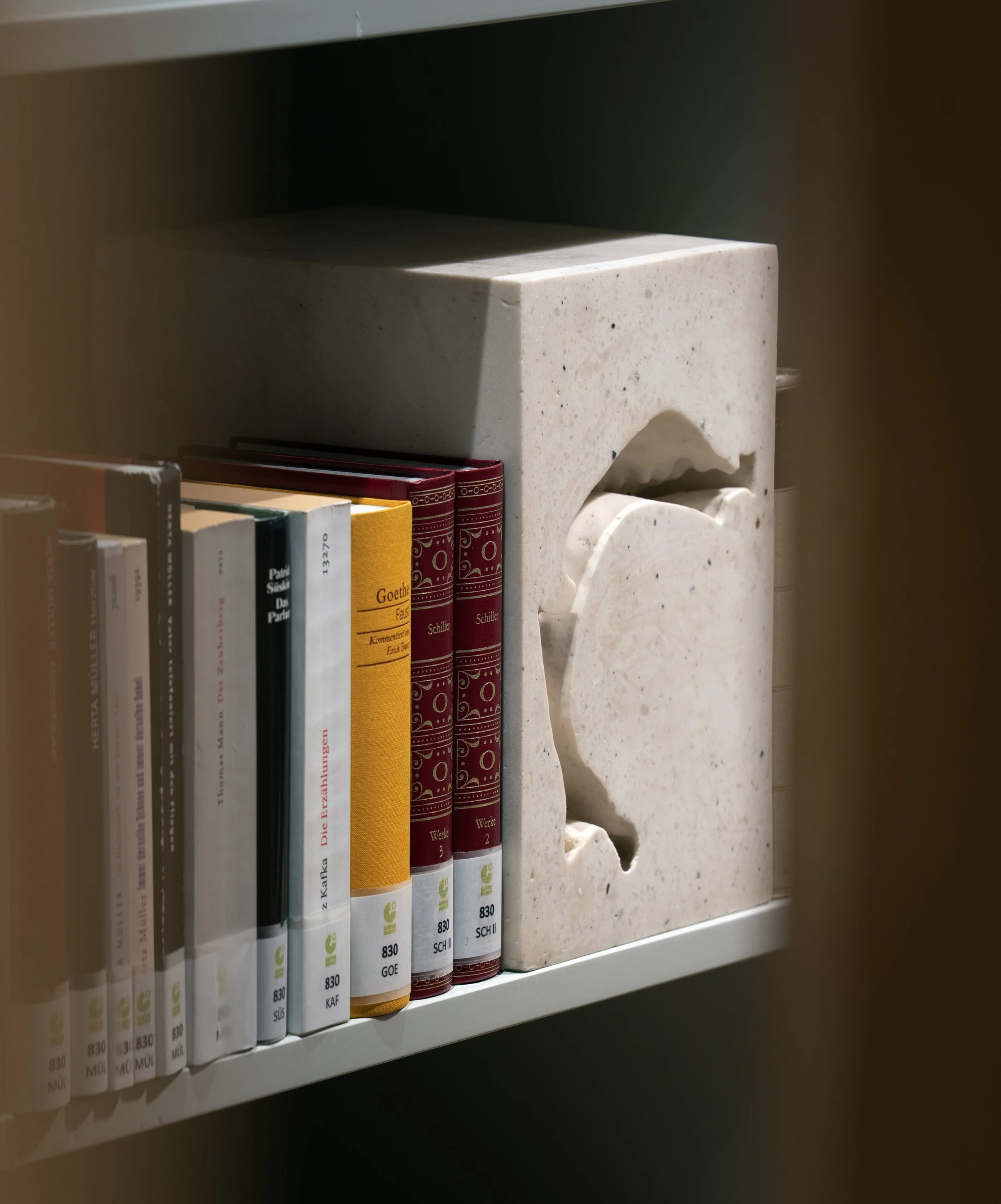 Sculptures showing speech organs in relief integrated into the library’s shelves.
