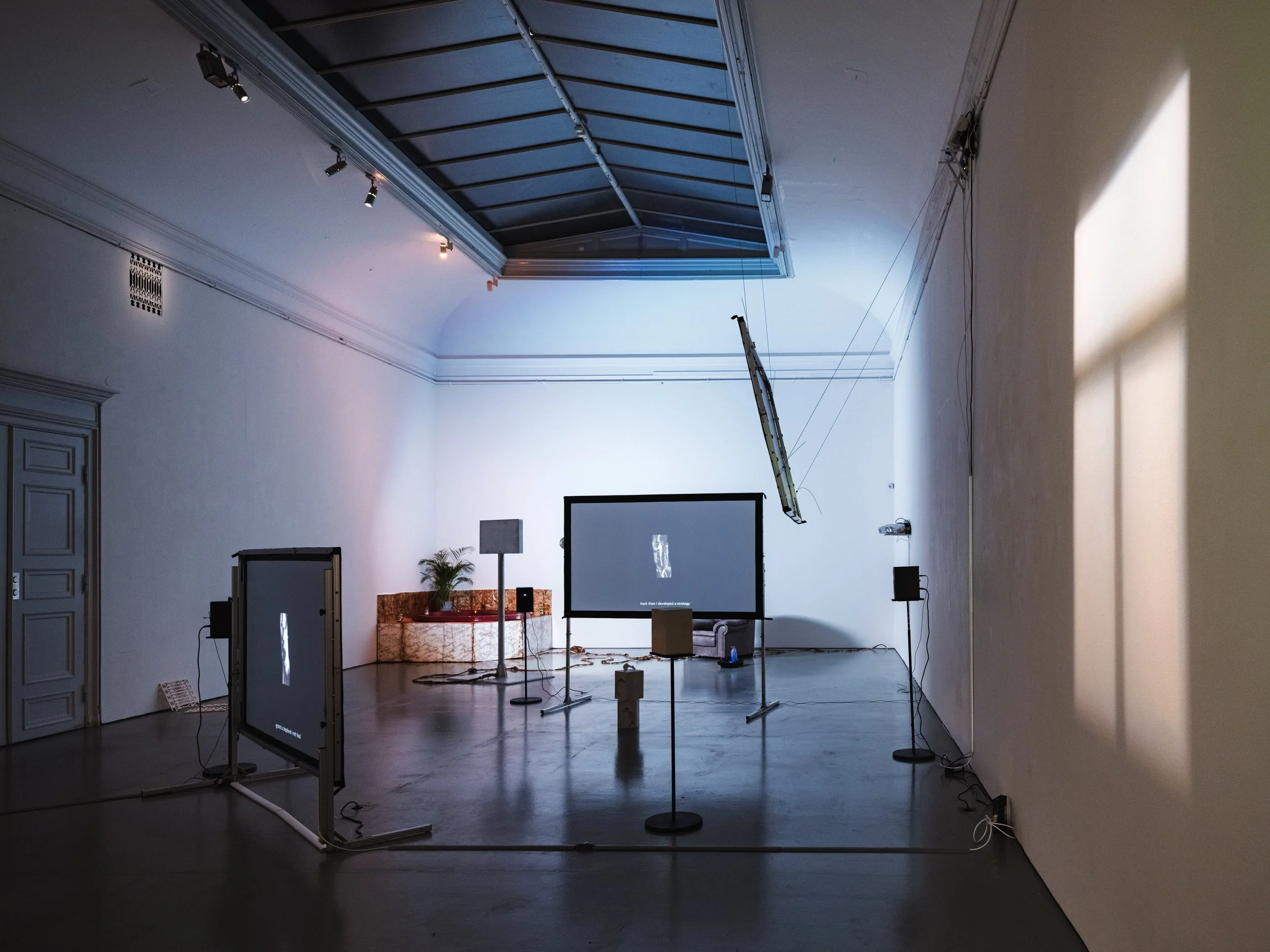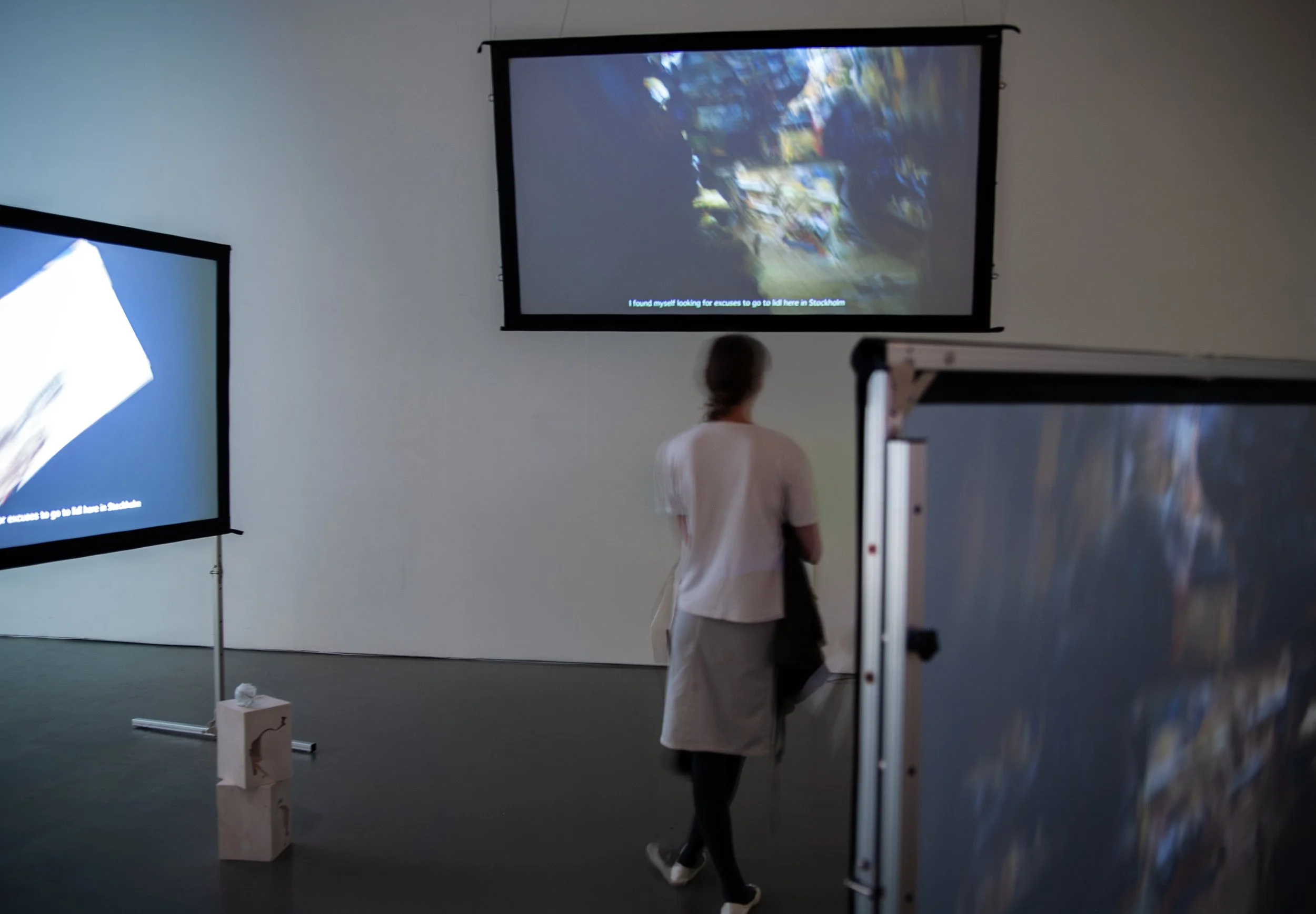 For the Royal Institute of Art’s MFA Graduation Show at Konstakademien, Aron exhibited the installation Drift which consisted of a three channel video/audio piece of 10min together with sculptural elements. It revolved around the subject of linguistics: